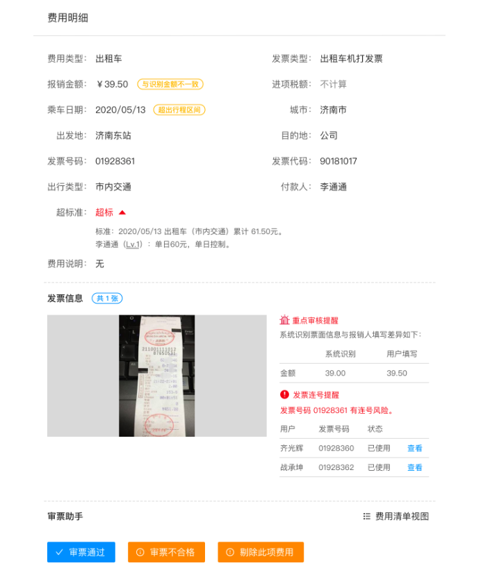 财务智能审票核验:⽀持系统复制智能审票,对财务需要重点关注的信息进⾏标识,⽐如发票连号、发票⽇期与报销⽇期不 符、发票⾦额与报销⾦额不符等情况。财务审核员可以通过智能审票,剔除不合规的费⽤或者修改报销⾦额。