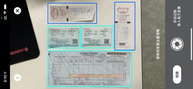 悦报销智能识票,一次可以识别多张发票,并且同类发票还可以合并录入,系统自动通过OCR识别发票类型、内容。收到的发票会放入发票夹里备用。