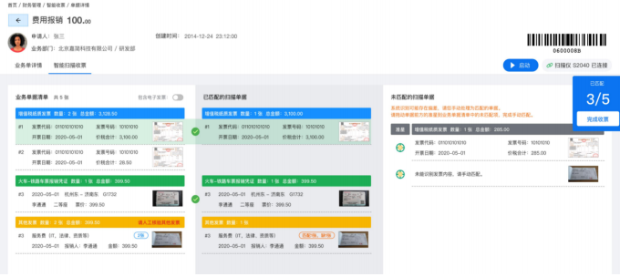 悦报销系统支持信封签收的方式收票,也支持对接高速扫描仪智能识别并且匹配线下线上票据,极大的减少了财务人员收票的工作量。