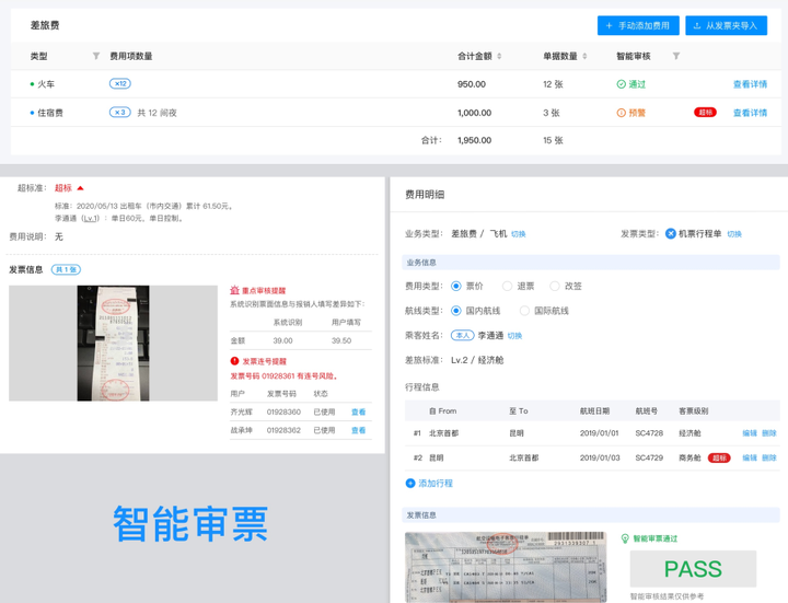 员工提交报销单后,悦报销系统可根据预先配置进行智能审核,极大提高了审核的效率和精准度。系统支持对费用做全面的合规管理。包含:发票连号,发票日期与报销日期不符,发票金额与报销金额不符等情况。财务人员可以通过智能审票,剔除不合规的费用或者修改报销金额。