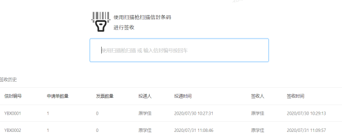 ⽀持对接硬件扫描抢扫码定位流程,⽀持信封签收的⽅式收票: