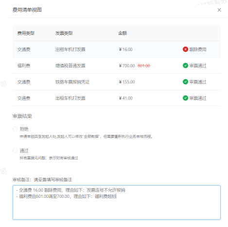 财务审核员可以通过智能审票,剔除不合规的费⽤或者修改报销⾦额: