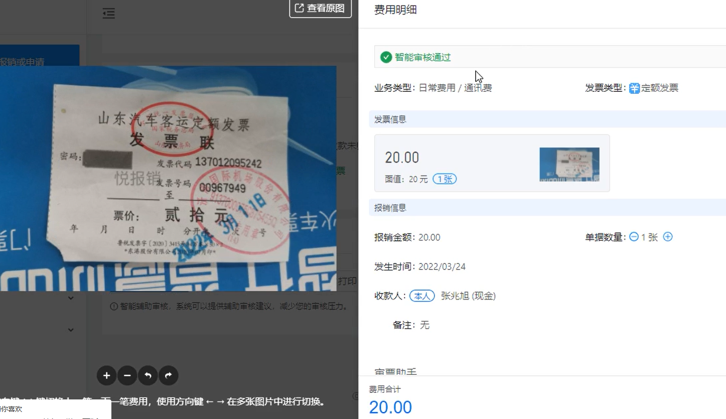 悦报销系统支持智能审票,对财务需要重点关注的信息进行标识,比如发票连号、发票日期与报销日期是否一致、发票金额和报销金额对比等情况。财务审核员可以通过智能审票,剔除不合规的费用或者修改报销金额。