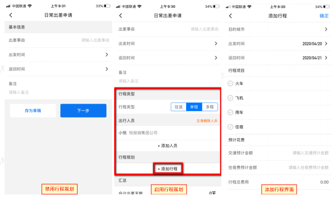 1)差旅申请:员工出差前只需提交出差申请单,审批通过后即可直接订购机票、酒店;平台可聚合各大平台航班、酒店信息,订购时,系统自动匹配校验员工差旅标准,支持按部门、项目、人员等多个维度进行差标控制,超标可实时提醒并进行审批;员工可在移动端随时随地进行差旅申请,突破时空限制。