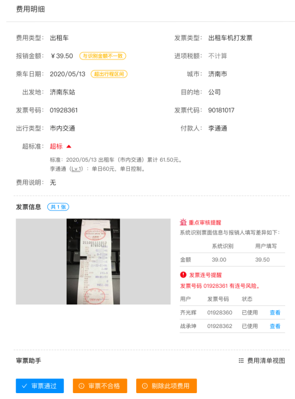 悦报销系统可自动连接到国家税务局的检查界面,而无需人工干预。 发票录入后可以立即查看发票原文件,以防止发票被篡改。财务人员审票可以自动检查发票是否作废,红冲,是否重复报销,如果重复报销,它会自动提示关键信息,例如上次注册的报销者和报销时间,从而防止重复报销。