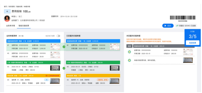 ⽀持对接⾼速扫描仪智能识别并匹配线下和线上票据,极⼤减少财务⼈员收票的⼯作量:
