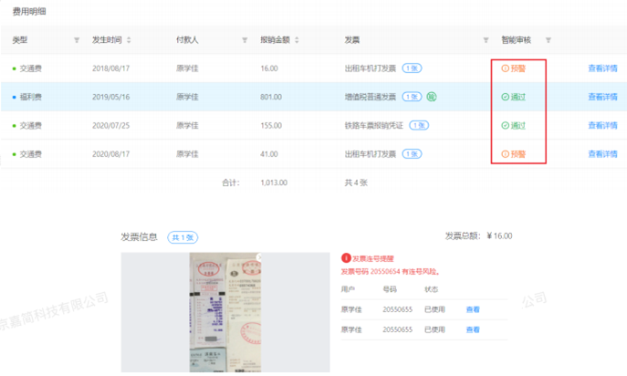 ⽀持系统复制智能审票,对财务需要重点关注的信息进⾏标识,⽐如发票连号、发票⽇期与报销⽇期不 符、发票⾦额与报销⾦额不符等情况。