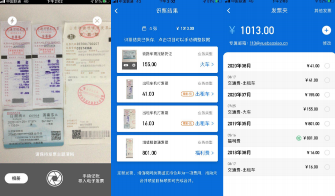 员工可以通过微信、⽀付宝、Web端上传、专属发票接收邮箱方式上传电子发票,也可以通过拍照 OCR 识别的方式将行程单等信息录入系统。后台系统集成税务系统,自动完成发票数据的读取、验真、查重和抵扣税。员工可在 " 我的发票 " 中查看发票的报销状态。