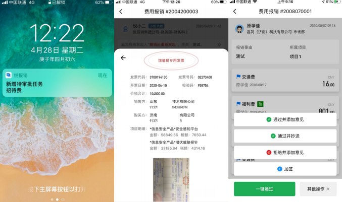 审批消息的提醒:支持邮件、App消息推送、微信推送等方式; 审批过程:审批人可以查看流程的具体信息,包括发票影像等审批结果:支持审批通过、审批拒绝、添加审批意见、加签、抄送等操作。