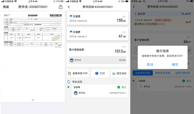 报销单格式支持自定义、支持电子签名;支持手机端无线远程打印报销单、支持同步打印电⼦发票。