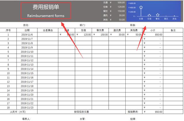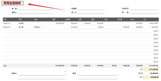 1、报销单内容包括:年月日,所属部门,业务岗位职位,报销明细,合计金额。