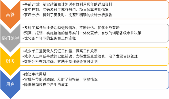 现在费用软件不仅局限于审批报销环节,而是向资源整合和管理服务方向延伸。费控环节从报销向预算控制延伸;费控报销产品向前端消费领域延伸,不断的拓展资源供应链,建立全流程自动化一站式平台,为企业提供更智能化、人性化的服务,有助于提升员工满意度。