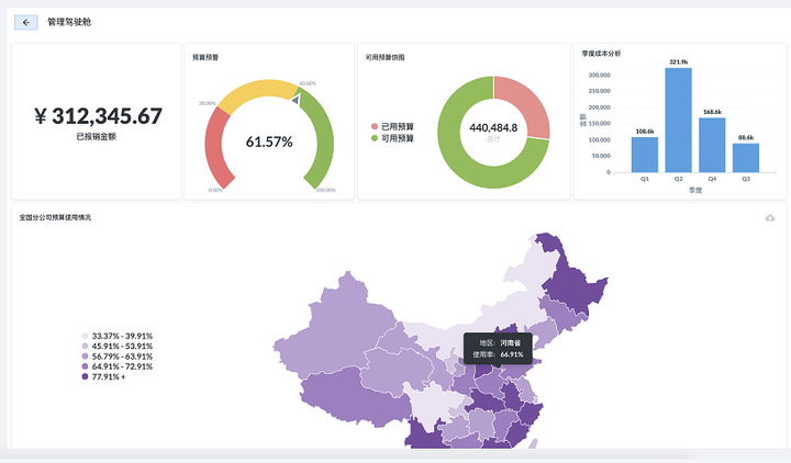直观的数据报表,涵盖了费用报销金额统计,月度花费,预算以及其他分析,通过这些数据分析,可以更好的管理费用。