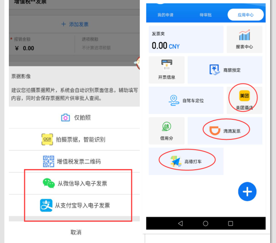和悦报销合作的app使用中产生的电子发票,可以一键导入发票夹,比如美团酒店,滴滴打车,高德打车等。