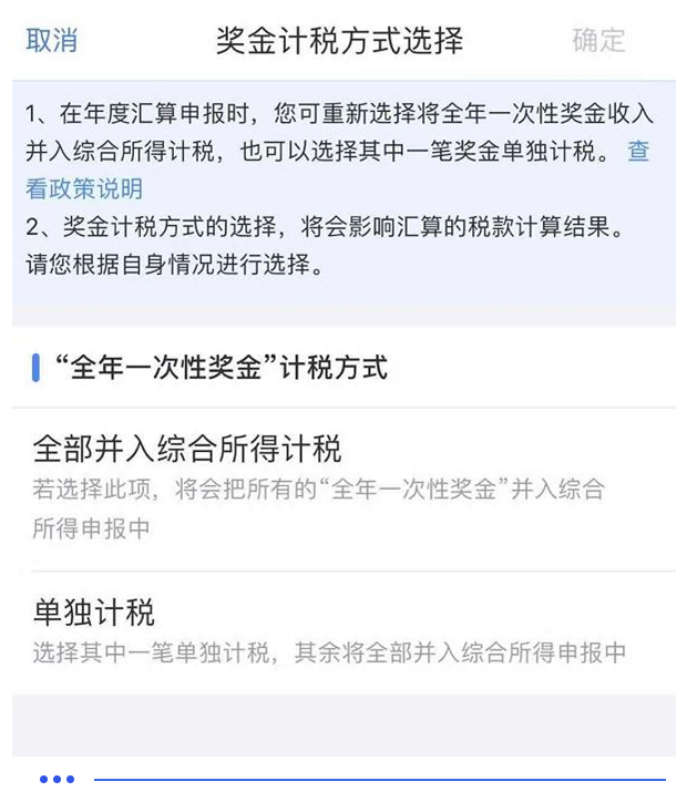 要想知道哪一个计税方法对自己更有利,一个很简单的办法就是,在个税APP上,两种计税方式都操作一下,但都先不要确认,比较一下哪种计税方式划算,就选择哪种。